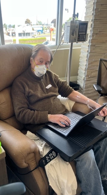 Back under the watchful eye of chemo. I started my new chemo capsule first thing this morning and then had a grueling, 9-hour infusing session today and it went well. The monoclonal antibody cocktail has risks of a lot of immediate side effects (cytokine storm the worse). I had one brief episode like the rapid onset of a bad cold. IV Benadryl and additional steroids took care of that. More side effects could come as this goes on, but right now I’m pleased how well I did.
